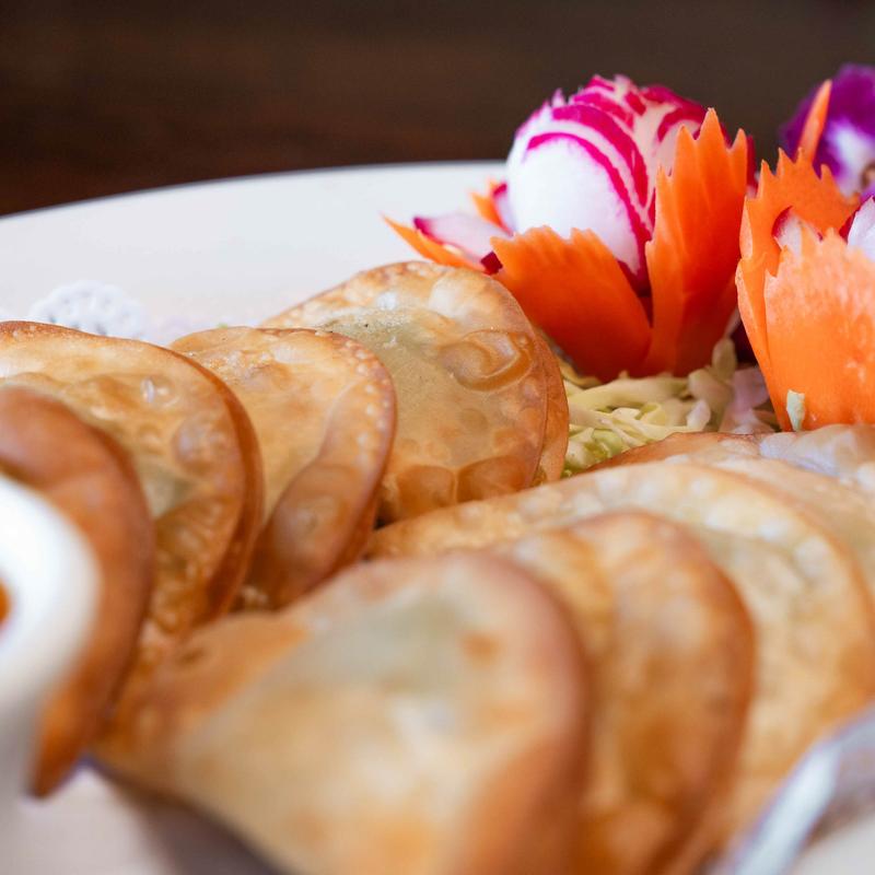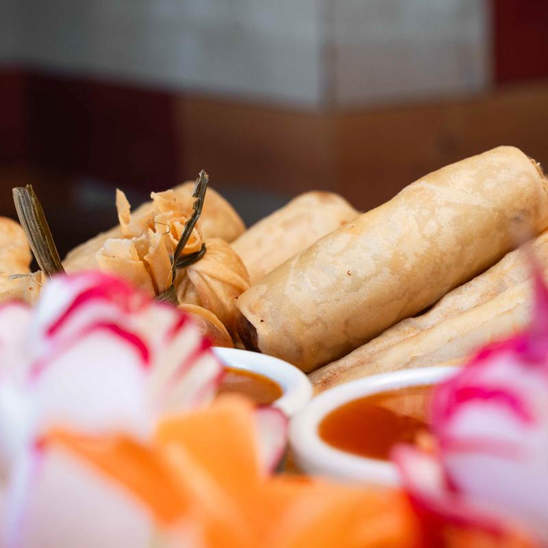 Selection of our most popular appetizers: chicken satay, golden fingers, golden flowers, crispy roll, half moon ton